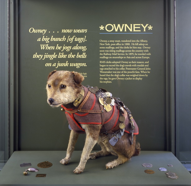 โอว์นีย์ Owney โดยทั่วไปแล้วเชื่อกันว่าเจ้าของเดิมของโอว์นีย์เป็นพนักงานไปรษณีย์ นั่นเป็นเพราะโอว์นีย์รักกลิ่นและสัมผัสของถุงไปรษณีย์มาก มันติดตามถุงเหล่านั้นไปทั้งทางบก ทางรถไฟ หรือทางเรือ ในทุกๆ ที่ที่ถุงเหล่านี้ได้เดินทางไป เมื่อเจ้าของของโอว์นีย์จากไปด้วยสาเหตุที่ไม่มีการระบุถึง โอว์นีย์ก็ยังคงอยู่กับถุงไปรษณีย์สุดที่รักของมัน ณ ที่ทำการไปรษณีย์ต่อไป หลังจากนั้นไม่นาน โอว์นีย์ก็เริ่มเดินทางตามถุง เริ่มจากในรถขนไปรษณีย์คันเล็กๆ จากนั้นก็เป็นรถไฟขนไปรษณีย์ มันเริ่มเดินทางไกลขึ้นเรื่อยๆ จนได้เดินทางไปทั่วเขตที่มันอยู่ จากนั้นก็ทั่วรัฐ และในที่สุดมันก็ไปทั่วสหรัฐอเมริกา พนักงานไปรษณีย์เต็มใจปล่อยให้มันทำแบบนี้ไปเรื่อยๆ เนื่องจากพวกเขาเห็นว่า รถไฟขบวนที่โอวนีย์ขึ้นจะไม่ประสบอุบัติเหตุเลย ทำให้โอว์นีย์กลายเป็นเครื่องรางแห่งความโชคดี ดังนั้น พวกเขาจึงทำเครื่องประดับและเหรียญตราอันเล็กๆ ติดปลอกคอของมันเพื่อเป็นของที่ระลึกถึงที่ๆ มันเคยไป เมื่อมันเดินทางมากเสียจนเหรียญเหล่านี้ไม่มีสามารถติดบนปลอกคอได้อีก มันก็ได้รับเสื้อแจ๊คเก๊ตมาใส่แทน โอว์นีย์ได้เดินทางไปทั่วอเมริกา ยุโรป และเอเชีย ทั้งขาไปและขากลับ และยังมีแสตมป์เป็นของตัวเองอีกด้วย